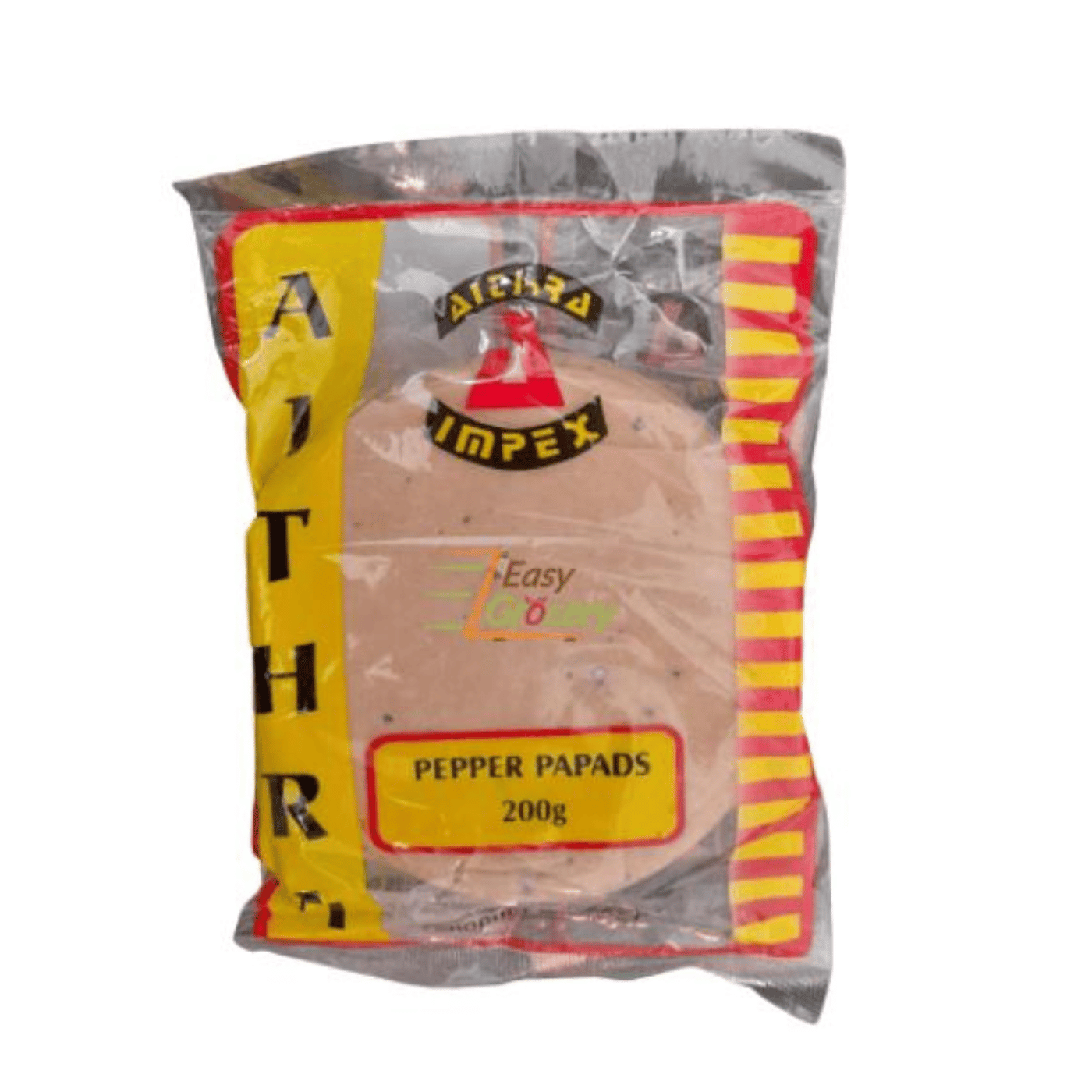 Pepper papad (also known as kali mirch papad) is a variety of Indian papadum seasoned with black pepper, giving it a bold, spicy kick. It's made from urad dal flour (like plain papad), but is studded or blended with crushed black peppercorns for heat and aroma.