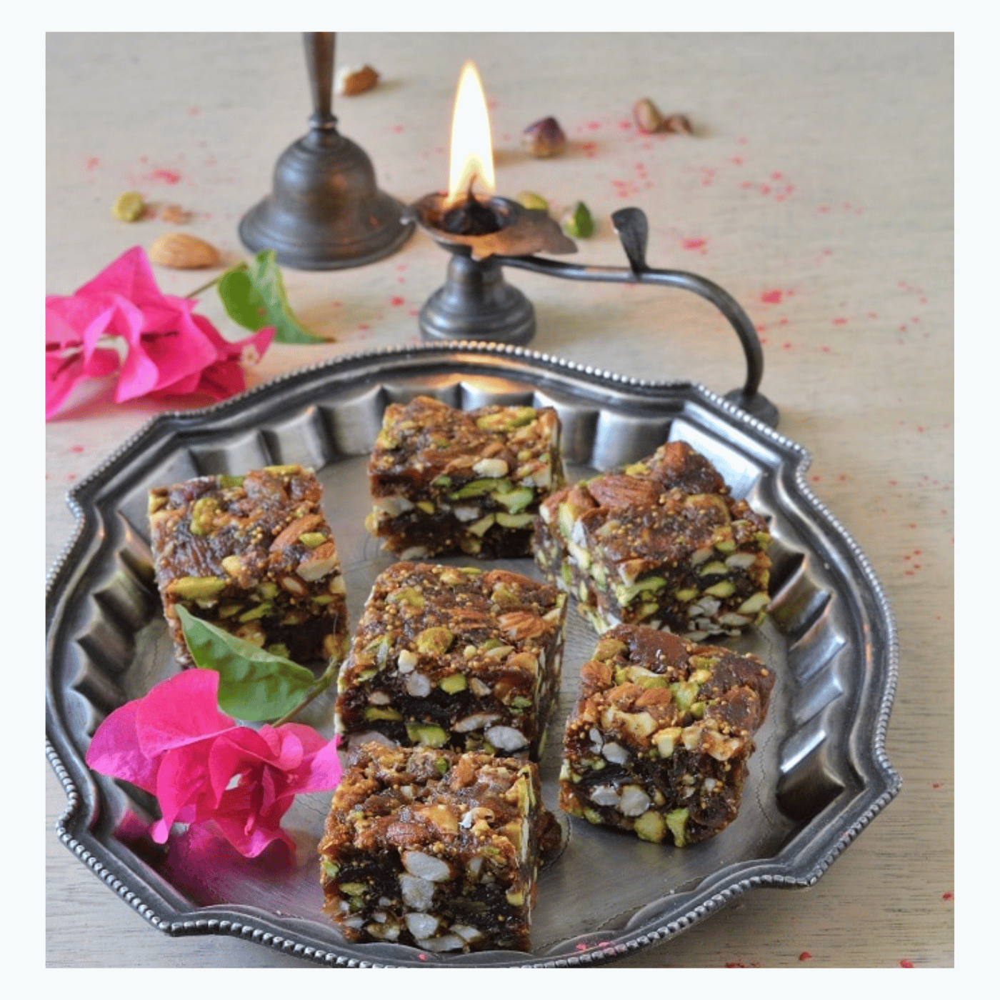 Anjeer Barfi is a delicious Indian sweet made with dried figs (anjeer), nuts, ghee, and sugar. It has a rich, nutty flavor and a soft, chewy texture. It's a healthy and indulgent treat often served during festivals and special occasions.