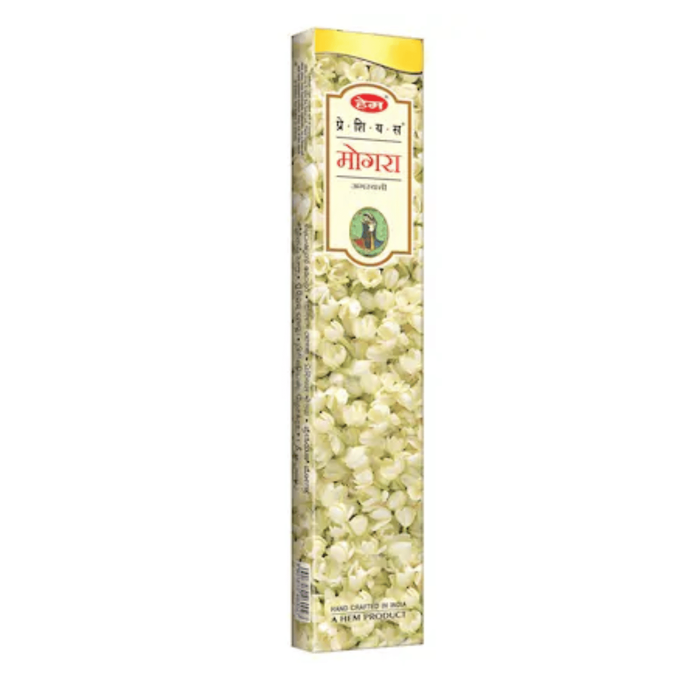 HEM Precious Mogra Incense Sticks are a popular choice for those seeking a soothing, floral fragrance reminiscent of jasmine. These hand-rolled incense sticks are known for their calming and uplifting properties, making them ideal for meditation, relaxation, or creating a pleasant ambiance in your space.