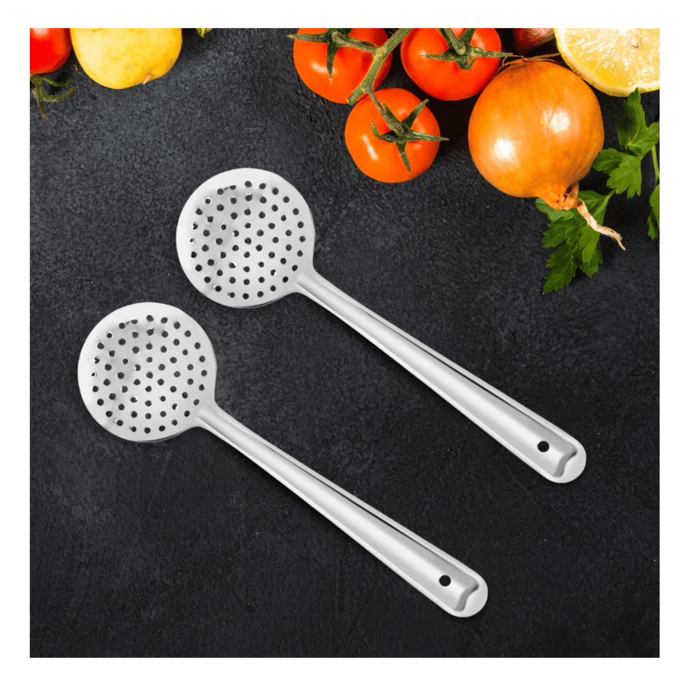 A skimmer is a flat, broad kitchen utensil with a long handle and a perforated or mesh surface, designed to lift food out of hot liquids while letting the liquid drain away. It's especially useful when frying, boiling, or blanching, making it a must-have for everyday cooking tasks.
